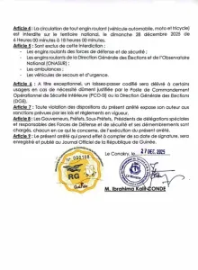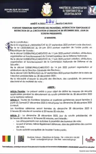 Selon le texte, toutes les frontières terrestres et maritimes de la Guinée seront fermées du samedi 27 décembre à minuit jusqu’au dimanche 28 décembre à minuit. Les frontières aériennes, quant à elles, seront fermées le dimanche 28 décembre de 5 heures à 23 heures 50 minutes.